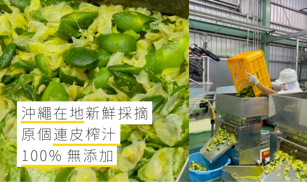 剛摘下來的新鮮沖繩香檸立即連皮一起榨汁,製成100%香檸果汁。沖繩香檸的主要成分:川陳皮素,多含在果皮中,這是對身體健康和美容都相當不錯的營養素。連同果皮一起榨汁,能更好的吸收川陳皮素。沖繩香檸的川陳皮素含量是柑橘類中數一數二,是近年來備受矚目,常常被推薦的健康食材。