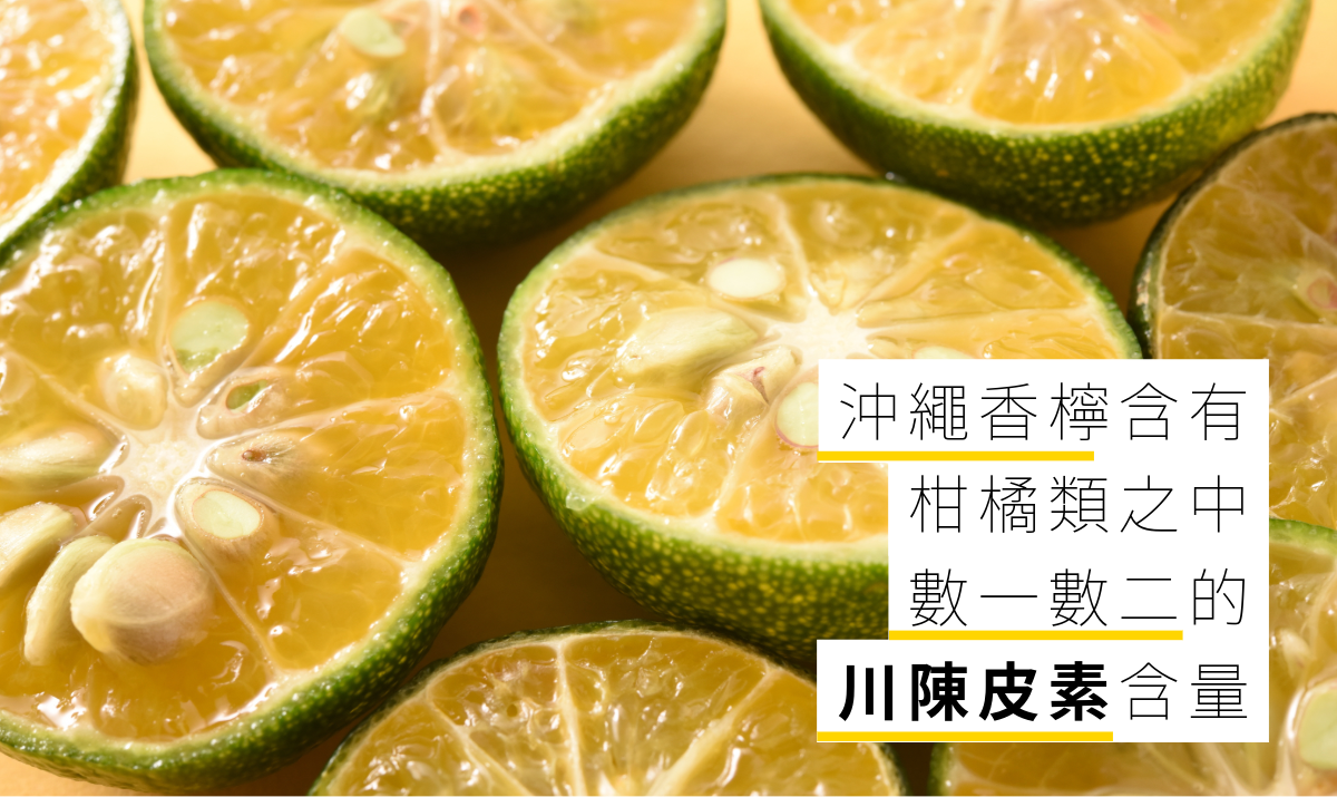 沖繩香檸含有豐富的川陳皮素、橘紅素、甜橙黃酮、橙皮素和檸檬酸等對身體非常有用的成分。 根據日本的研究,沖繩香檸的川陳皮素含量是柑橘類中數一數二。